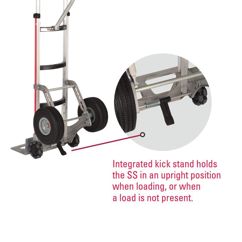 Magliner (SS) self-stabilizing hand truck built with standard wheels as well as smaller double row multi-directional wheels.
